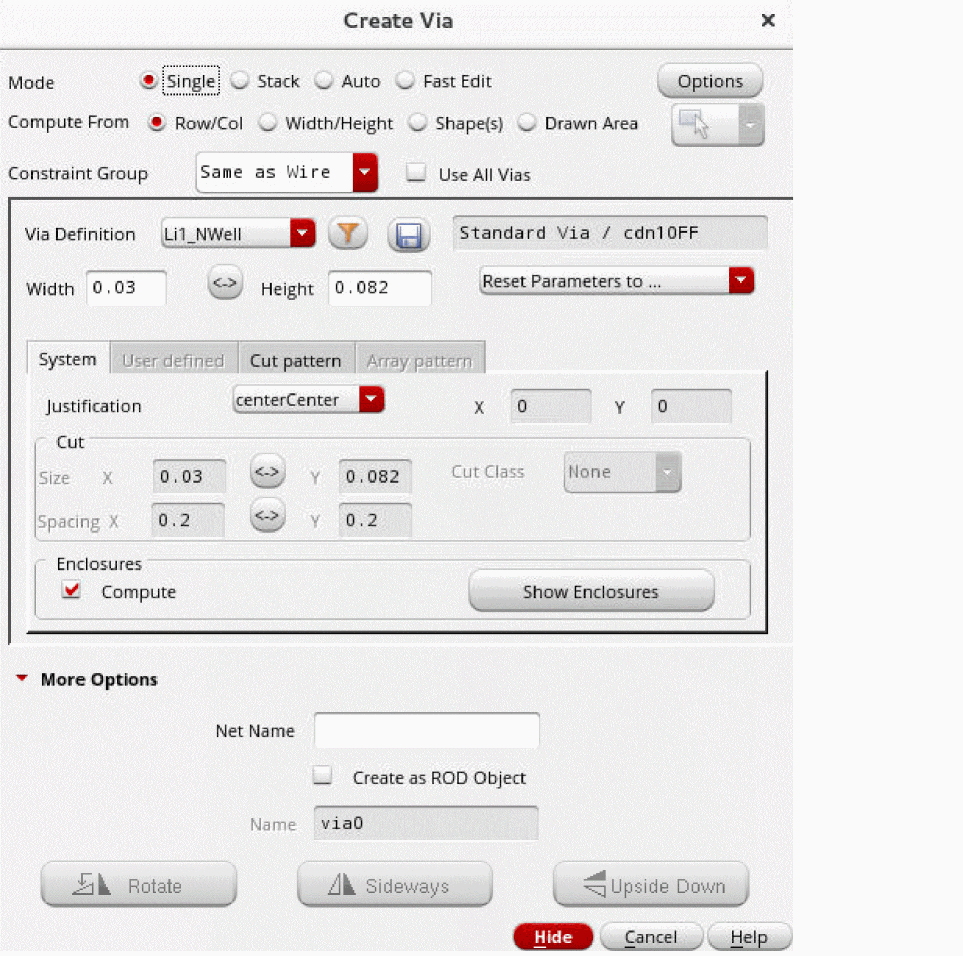 - From the Cut Class list, select the cut class you want to be available by default for the respective viaDef/via variant in Single mode. The selected cut class is also used by the Stack and Auto automatic via creation engines.