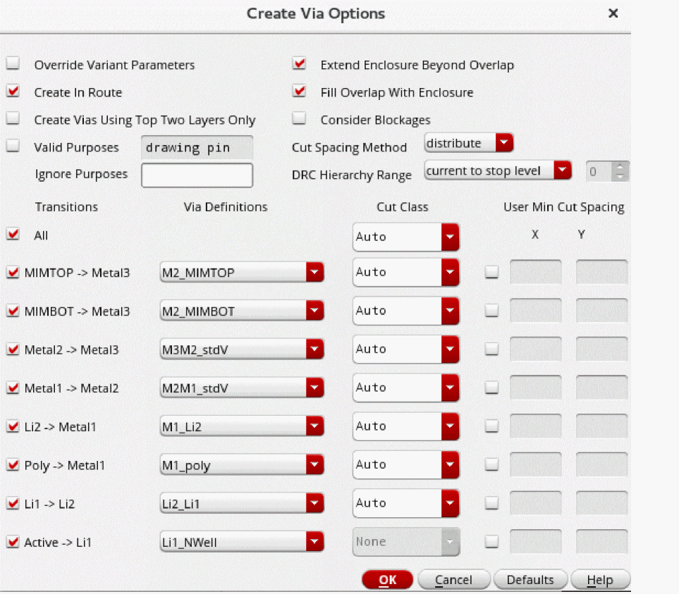 - From the Via Definitions list, select a viaDef/via variant for each layer pair. The selected viaDef/via variant is also used by the Stack and Auto automatic via creation engines.