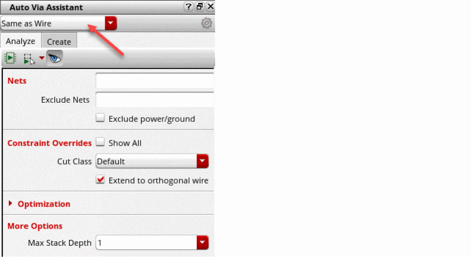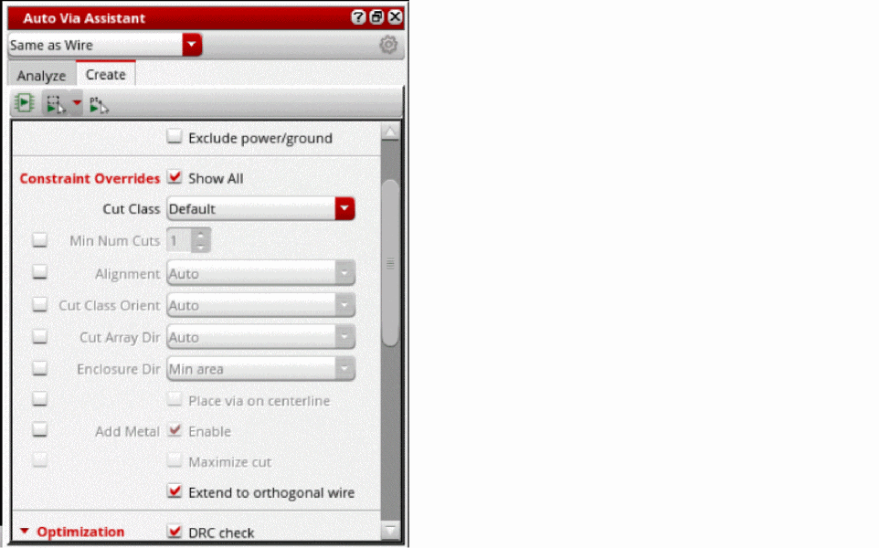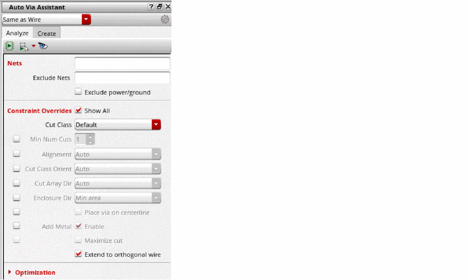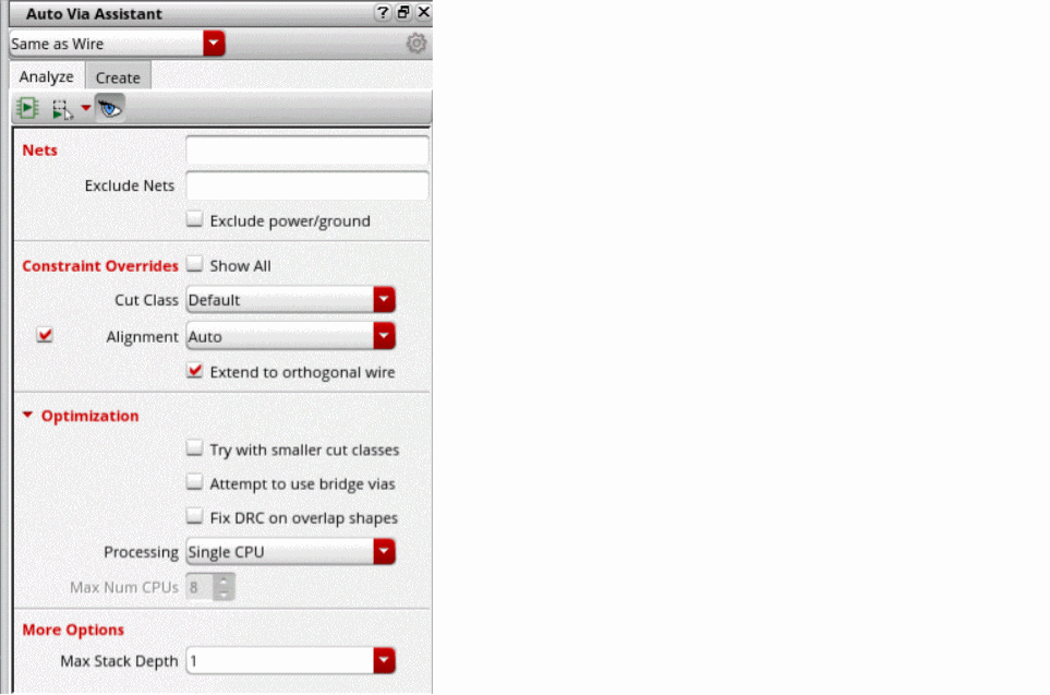 - Specify the analysis optimization options in the fields: Try with smaller cut classes, Attempt to use bridge vias, Fix DRC on overlap shapes, Processing, and Max Num CPUs.