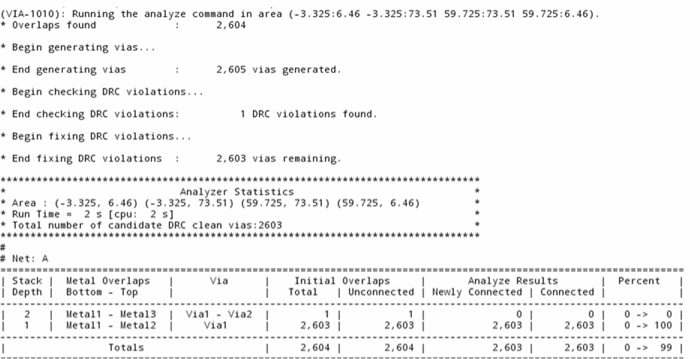 An auto via analysis report is generated in the CIW, as shown below.