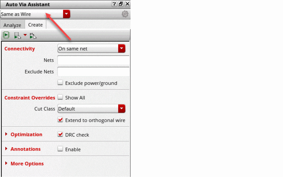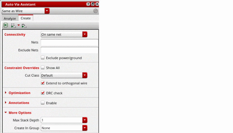 - Specify the optimization options for creating vias in the fields: DRC check, Try with smaller cut classes, Attempt to use bridge vias, Fix DRC on overlap shapes, Processing, and Max Num CPUs.