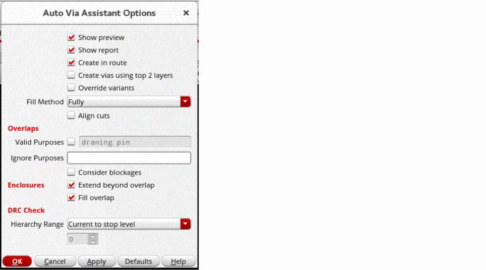 Specify the options in the available fields for creating auto vias. -