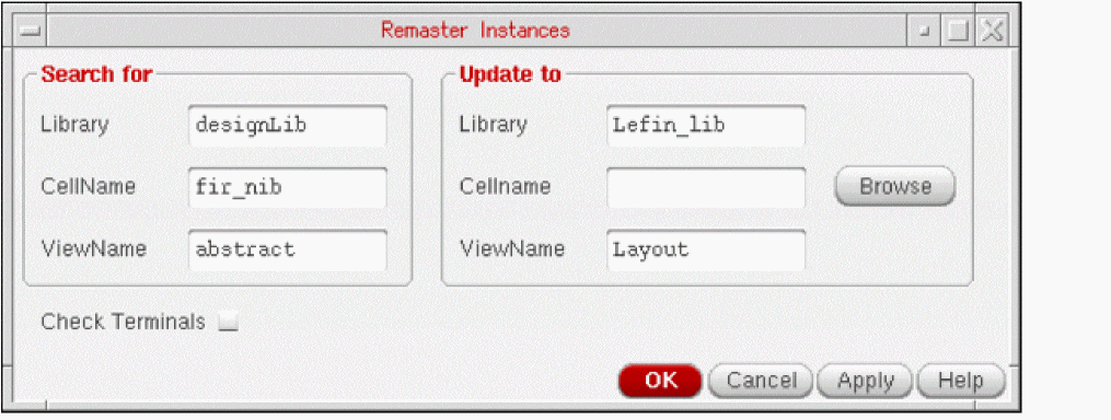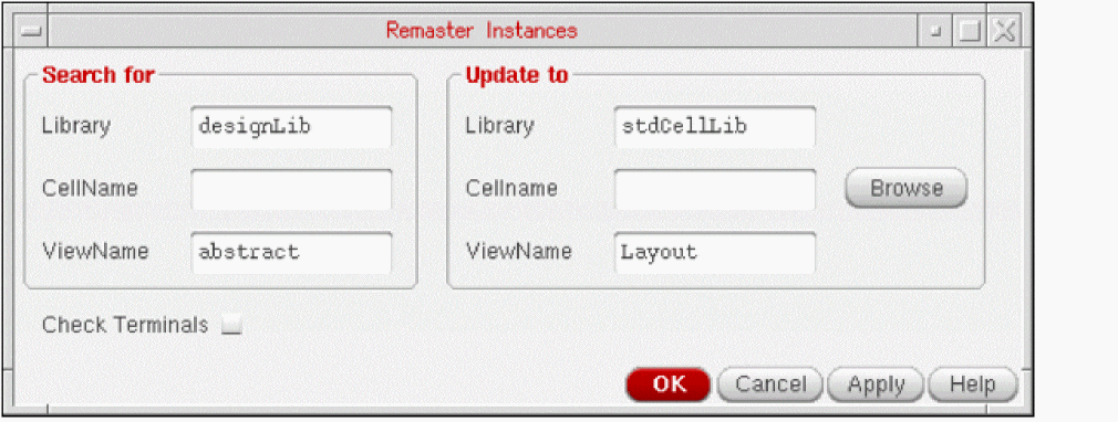 The following are some of the common types of searches and remastering of cellviews you can perform using the Remaster Instances form. The following figure shows that all instances in the current cellview that have masters from the library designLib and the view abstract are remastered to the library stdCellLib and the view Layout, and their master cell names are not changed.