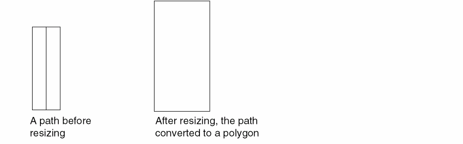 When you resize an object such as a path by using size, the object is converted to a polygon. When you use the Layer Generation form, the original path remains and the new object on the new layer is converted to a rectangle or a polygon.
