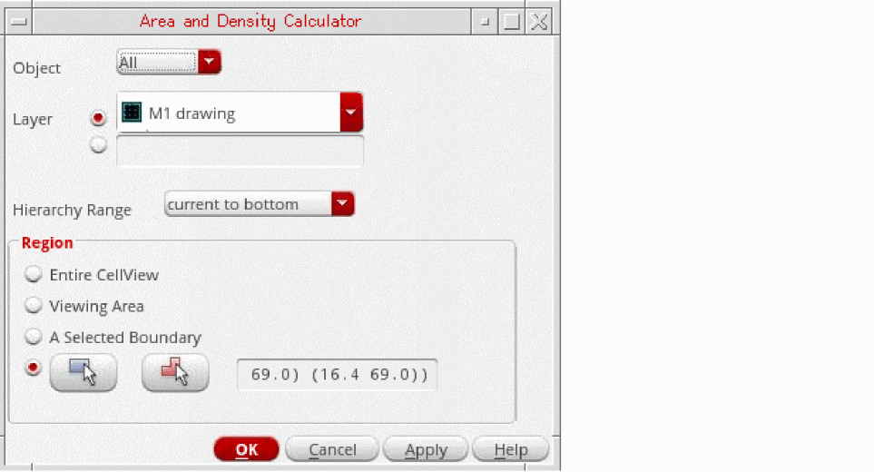 - In the Region section, select the region for which you want to calculate the area and density. You can select Entire CellView, Viewing Area, A Selected Boundary, Draw a Rectangle Region on the Canvas, or Draw a Polygon Region on the Canvas.