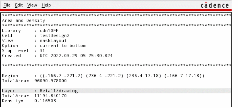 Area is defined as the total area of the specified layers within the region that you select. Density is defined as the total area divided by the area of the region that you specify. You can calculate the area and density by using the Area and Density Calculator command. You can also use the SKILL function leComputeAreaDensity.