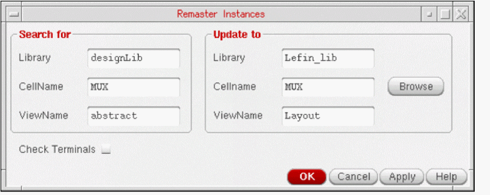 If the CellName field is left blank, the Remaster Instances command searches throughout the entire library in the Update to section for matching cellview names. - In ViewName, type the name of the view (abstract) to be remastered.