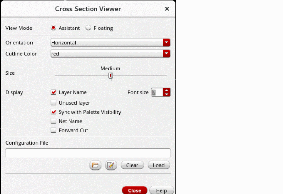 - Specify the display settings, whether you want the names of used layers, unused layers, and nets to be displayed in the cross section. You can enable Forward Cut to display the vias present between two adjacent layers even if those vias are not directly under the cutline.
