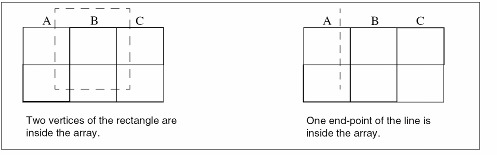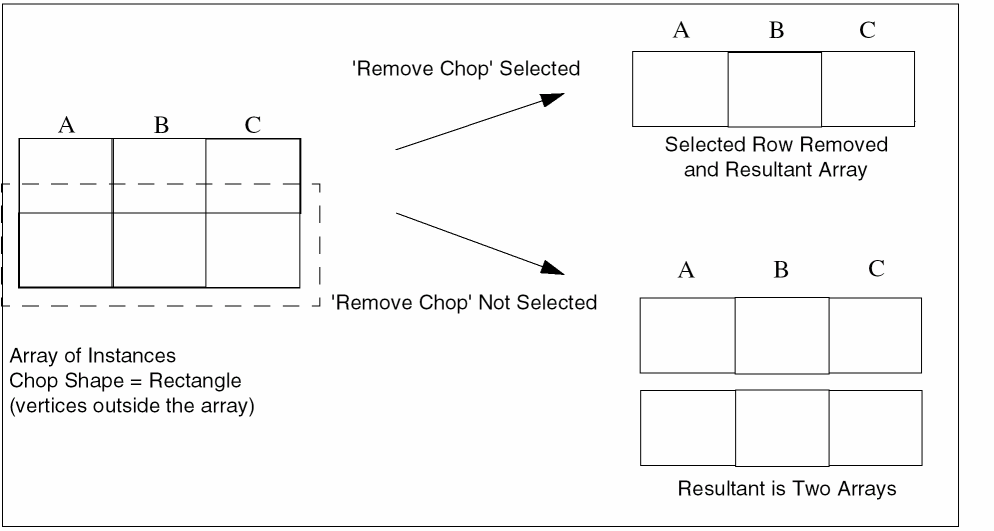 You can chop an array of instances (mosaic) or a group array. When you define the chop area for an array, none of the points of the chop area, which is vertices of the rectangle and polygon and end points of a line, should be contained within the array. The vertices or end points should be either outside the array or on the boundary of the array. This is explained in the following figures.