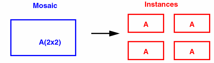 Converts selected mosaic to instances. Each instance inherits the name, orientation, and origin of the mosaic from which it is derived.
