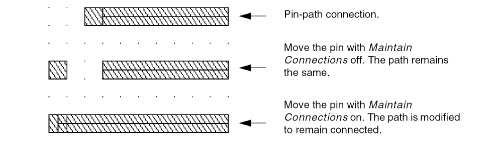Maintain Connections is a background process that monitors the connectivity of pins that abut or overlap path or pathSeg ends on the same layer. When any editing activity causes the pin to move away from the path or pathSeg end, Maintain Connections automatically modifies the path or pathSeg so that it remains connected to the pin.