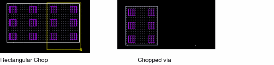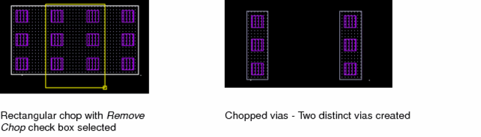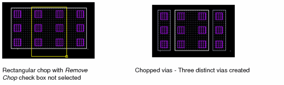 If the Chop Shape is set to rectangle or line, two distinct vias for each original via are created. However, if the Chop Shape is set to polygon, then n distinct vias are created. However, a limitation in case of chopping vias is that if any region of the chop shape is non-rectangular, then a via is not created in the non-rectangular region.
