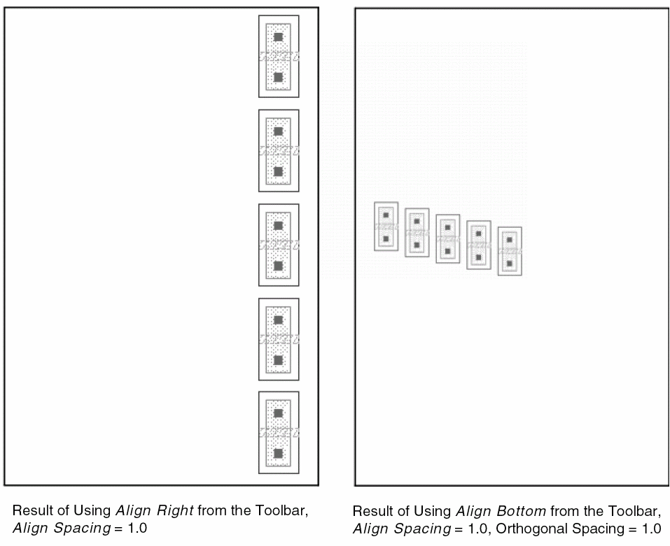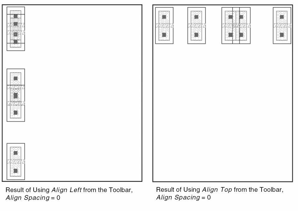 If Align Spacing is on, the object closest to the center of the imaginary bounding box around the selected set is regarded as the reference object. Remaining objects are aligned vertically or horizontally with respect to the reference object, separated by Align Spacing distance and Orthogonal Spacing, if specified.