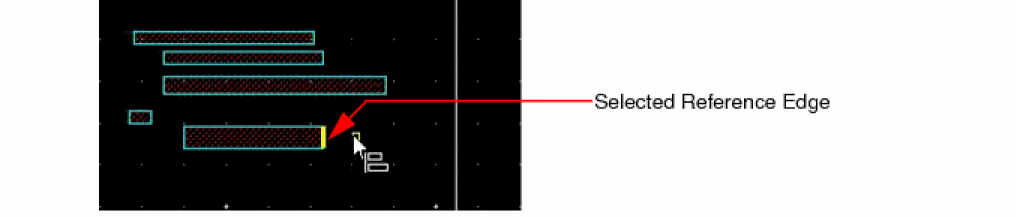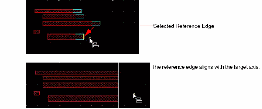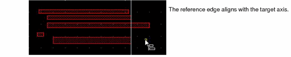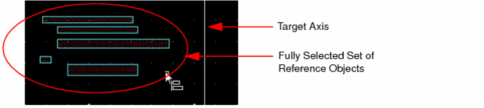 The object with the reference edge moves to align with the target axis. All the objects in the reference set move by the same distance. The relative spacing amongst the reference set objects is maintained.