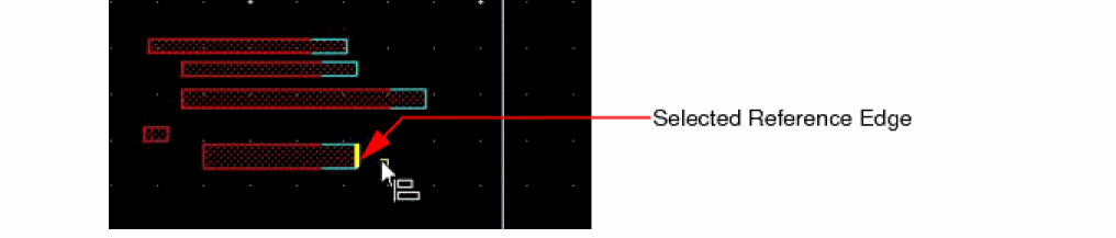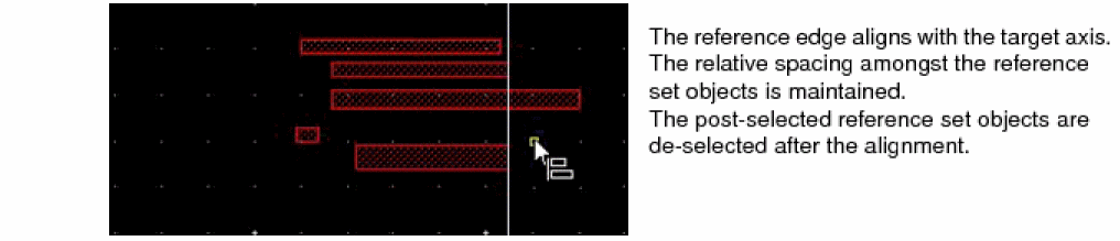 The object with the reference edge stretches to align with the target axis. All the objects in the reference set stretch by varying amounts to align with the target axis, as the reference edge. The relative spacing amongst the reference set objects is lost.The post-selected reference set objects are deselected after the alignment.