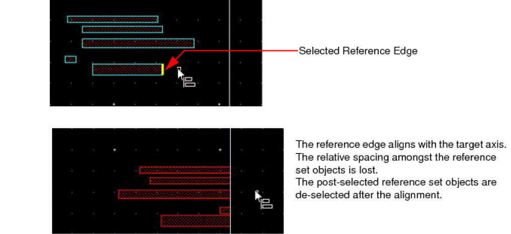 The object with the reference edge moves to align with the target axis. All the objects in the reference set move by varying distances to align with the target axis, as the reference edge. The relative spacing amongst the reference set objects is lost.
