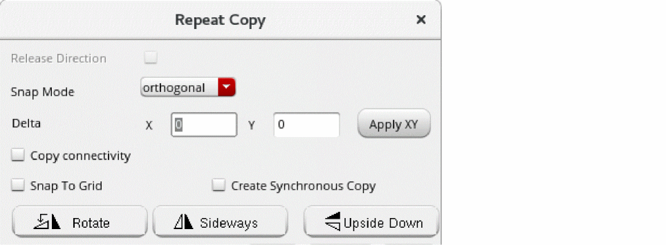 Alternatively, you can specify the distance at which to place the copy in the Delta X and Y fields in the Repeat Copy form and click the Apply XY button. The copy is placed at the specified distance from the object. -