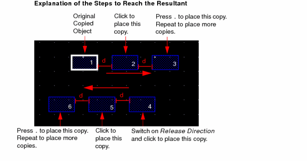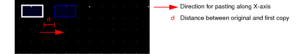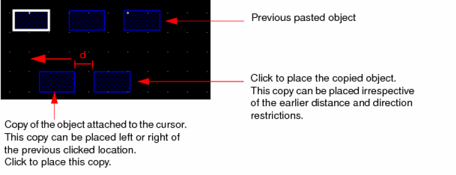 The distance d between the object and its first copy and the direction in which the copy is placed determine the placement distance and direction of the subsequent placed copies. After you place the first copy, the distance and direction are fixed.