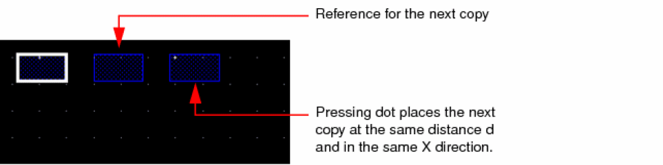 The previous placed object is taken as the reference. A copy is placed at the same d distance from the previous copy and in the same direction in which the previous copy was placed.
