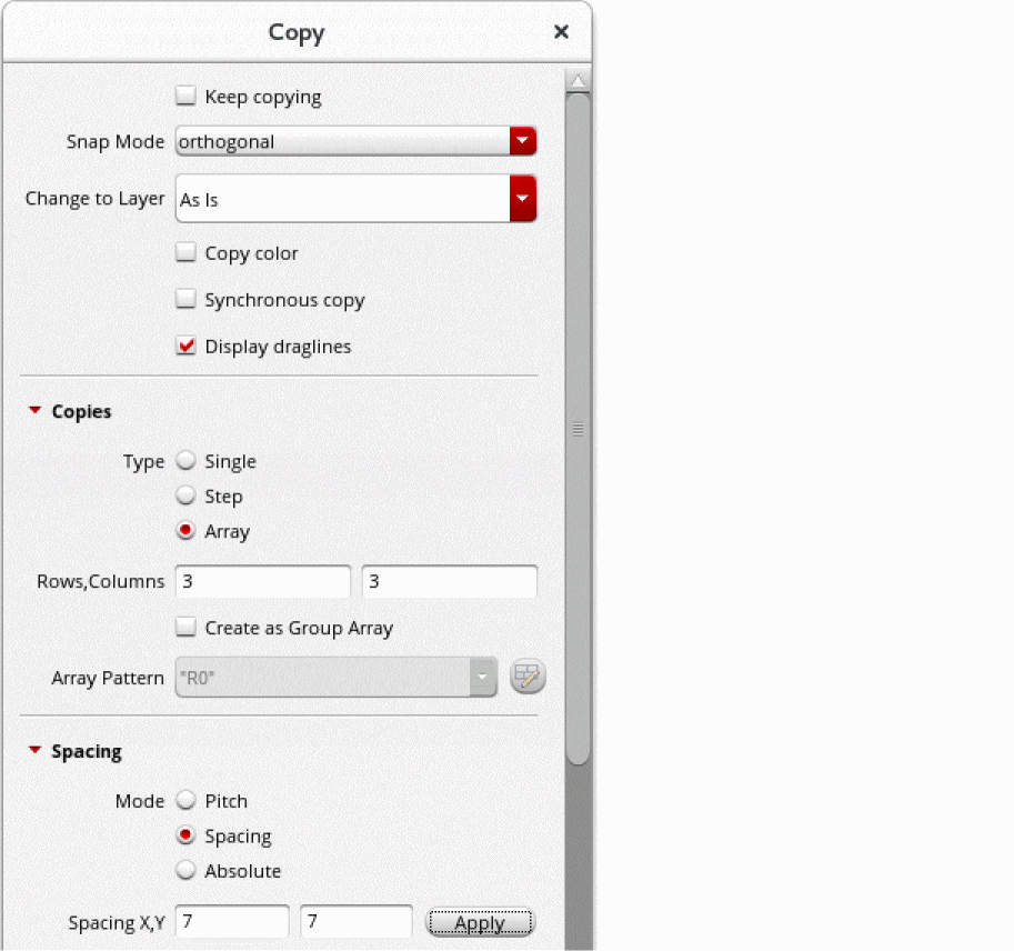 F3to open the Copy form. - With the Array check box selected as the copy type, in the Rows and Columns fields, type the number of rows and columns you want in the array.