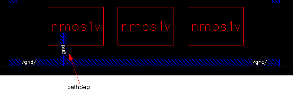 The following image shows a design with three devices and a power rail, with routing created for the first device using a pathSeg.