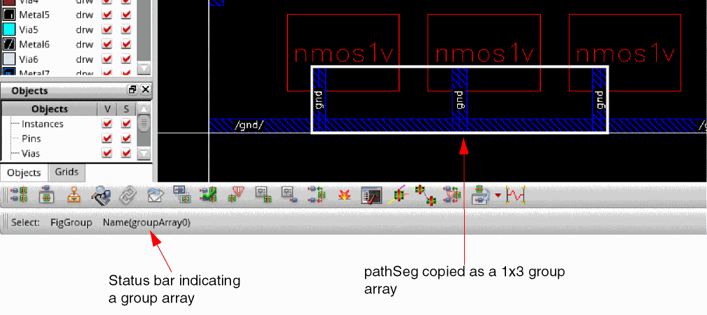 Certain custom and digital designs, such as those containing memory arrays and routing channels, might require patterns of objects to be repeated across a design. You can use group arrays to create such repeated patterns in your designs.