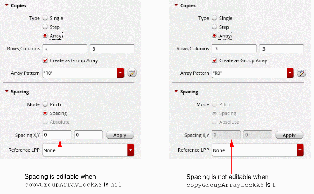 To ensure design integrity, while creating group arrays, designers can be prevented from specifying spacing mode and values by enabling the copyGroupArrayLockXY environment variable. When copyGroupArrayLockXY is set to t, the options for specifying spacing mode and values for a group array appear disabled in the Copy form.