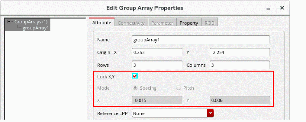 For an existing group array that has spacing defined, you can choose to lock the spacing settings so that users cannot modify them. You can lock an existing group array by selecting the Lock X,Y check box on the Attributes tab of the Edit Group Array Properties form. This disables the Mode options and X and Y fields, indicating that the spacing mode and spacing values for the group array cannot be edited.