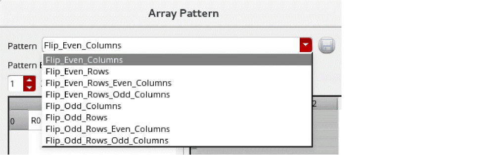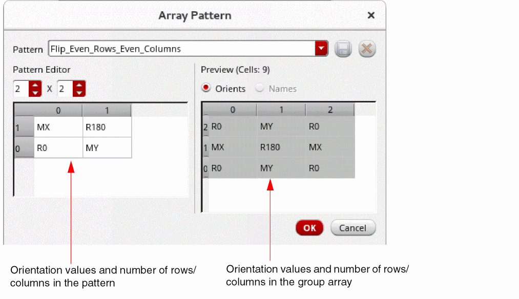 In the following image, the Array Pattern form displays the Flip_Even_Rows_Even_Columns pattern selected, which is a 2x2 pattern with "R0 MY" "MX R180" orientation values. The Preview section displays how the selected pattern is applied to the group array. It shows the actual number of rows and columns defined for the group array and the orientation value of each cell.