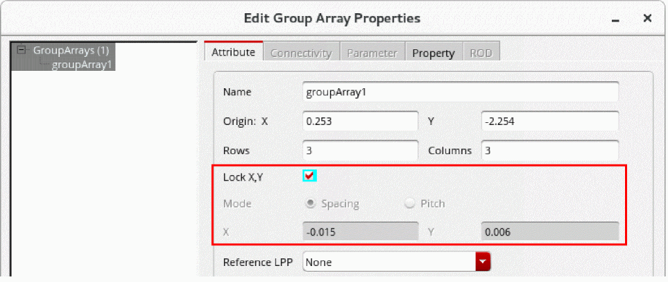 This disables the Mode options and the X and Y fields, indicating that spacing mode and spacing values for the group array cannot be edited.