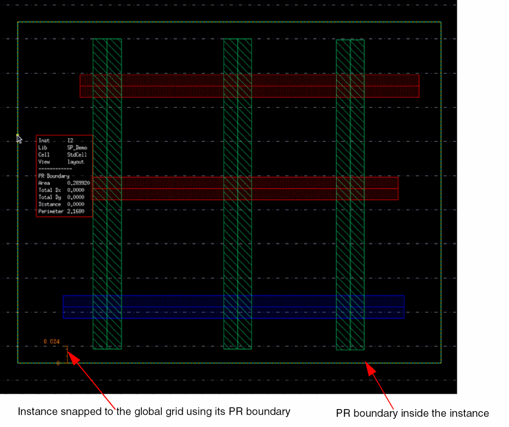 The placement offset is taken as the offset defined in the snap pattern definition of the global snap pattern. If the master contains a snap boundary, it is used for snapping. If no snap boundary is found, the PR boundary is used for placement. Otherwise, the origin axis of the instance is used as the reference point for instance placement.