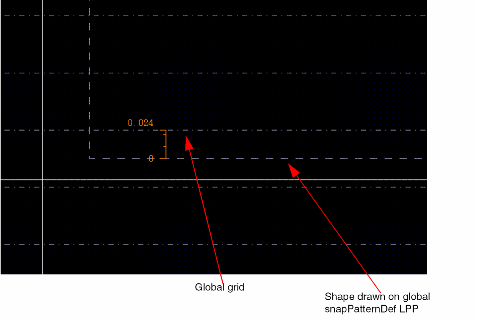 Anchoring by shape on global snapPatternDef LPP: The vertical grid is anchored to the lower edge of the drawn shape. In the example below, an offset of 24nm is shown.