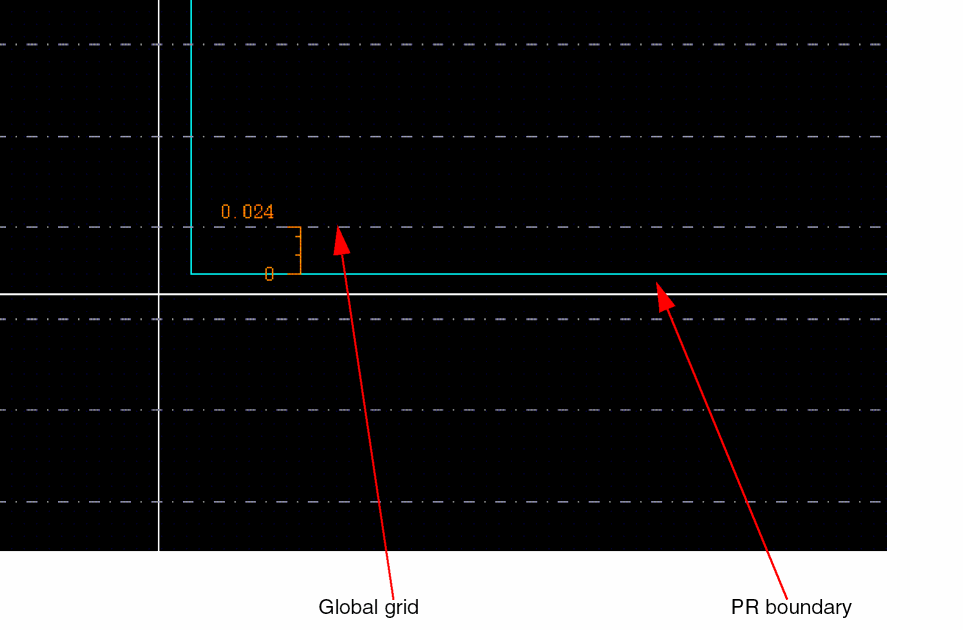 Anchoring by PR boundary: If no shape is drawn on global grid LPP, Virtuoso looks for a PR boundary. If it is found, then the global grid is anchored to the lower edge of the PR boundary.