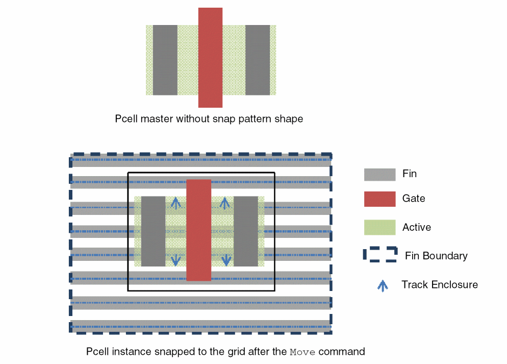 For example, consider a Pcell instance that does not contain a snap pattern, but it contains a shape on the Active layer. If this Pcell instance is moved over a snap pattern shape that applies to the Active layer, then the instance is snapped to the grid based on the shape on the Active layer using the enclosures attribute of the snap pattern definition.