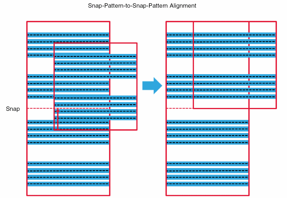 For snap-pattern-to-snap-pattern snapping, the computed period is used. The lower-left edge of the moving snap pattern is snapped to the closest period line of the target snap pattern. The track groups in snap-pattern-to-snap-pattern snapping are depicted in the figure below.