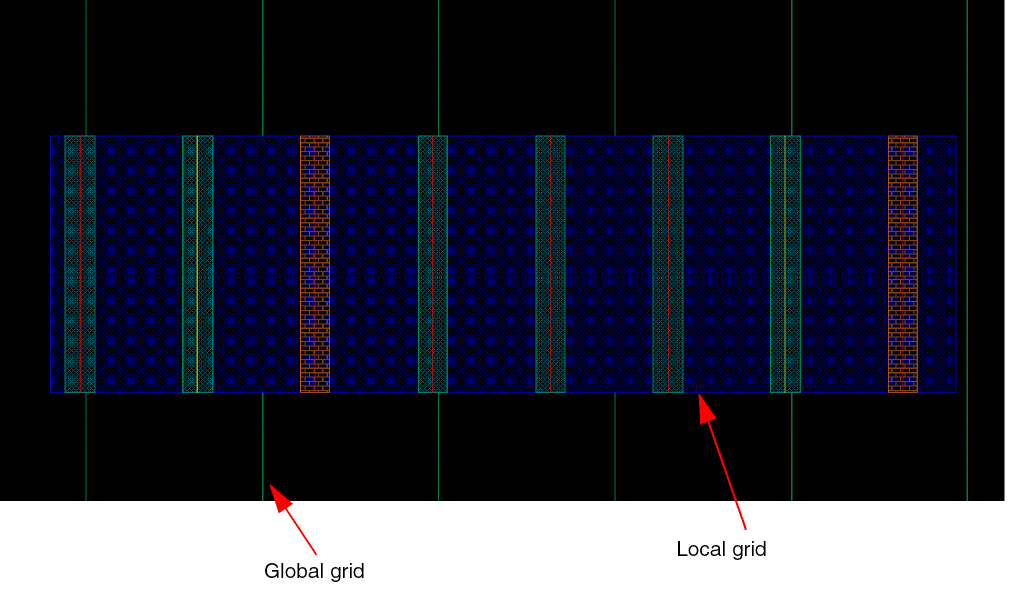 The following image shows a global snap pattern grid overlaying a local snap pattern grid.