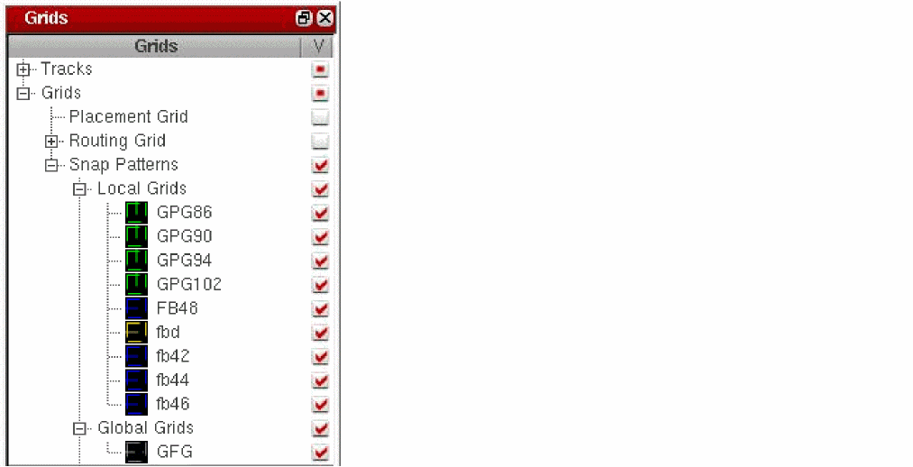 You can control the visibility of snap patterns, both the local and global grids, through the Grids panel of the Palette assistant.