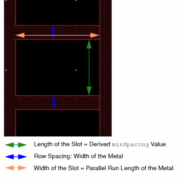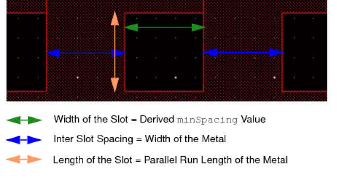 The spacing between slots is taken into consideration to derive the minSpacing value if a 1-D spacing table exists in the technology file. Both interslot spacing and the length of the slot are taken into consideration to derive the minSpacing value if a 2-D spacing table exists in the technology file.