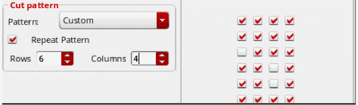 Sets the number of columns of the repeated pattern. If Repeat Pattern is not selected, the field is disabled. Depending on the number of rows and columns you specify in the Rows and Columns fields the row x column matrix is depicted by check boxes. You can select or deselect the check boxes to define the cut pattern that you want.