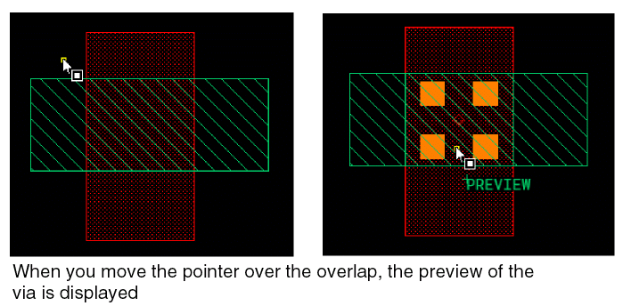 In Auto and Fast Edit via creation modes, a label PREVIEW is displayed close to the pointer. This ensures that you are aware that the displayed via is a preview and not a real via existing in the layout design. When you click the overlap area, the via is created and the PREVIEW label disappears.