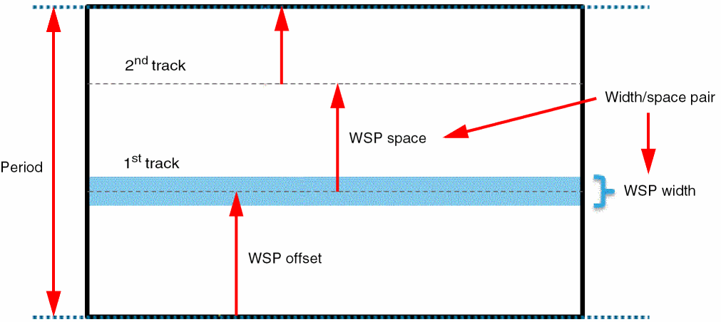 The figure below illustrates that each width spacing pattern is a sequence of width-space pairs. Patterns are specified as width and space pairs. Groups of width and space pairs can be repeated. The first track of the pattern is anchored to the period grid using an offset.