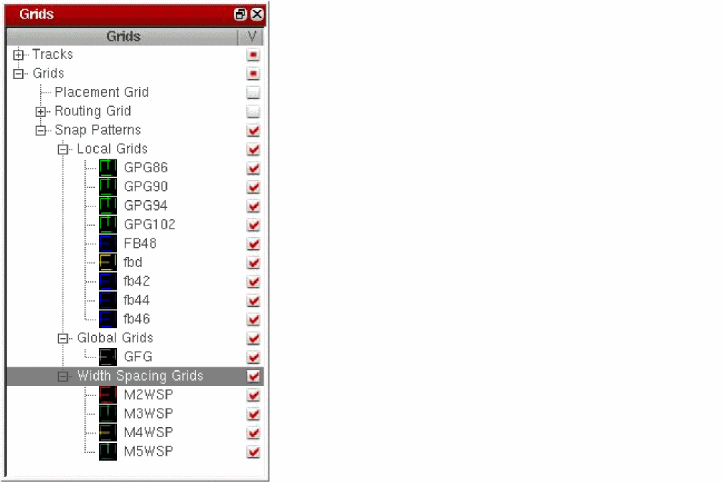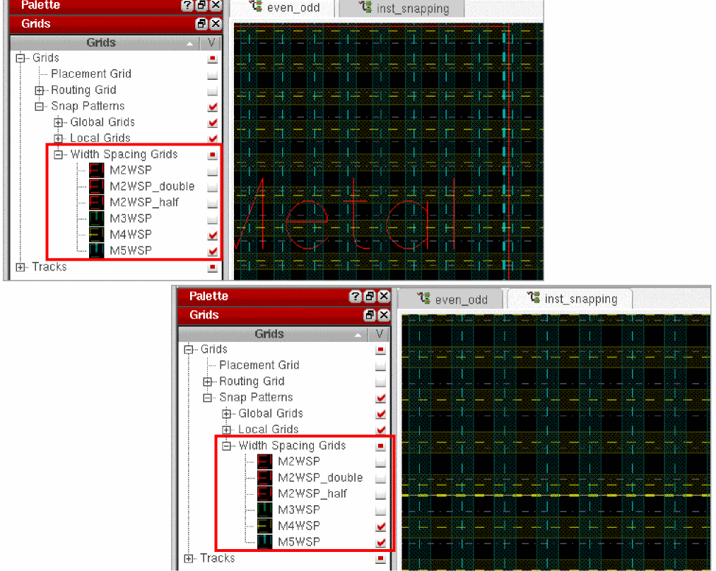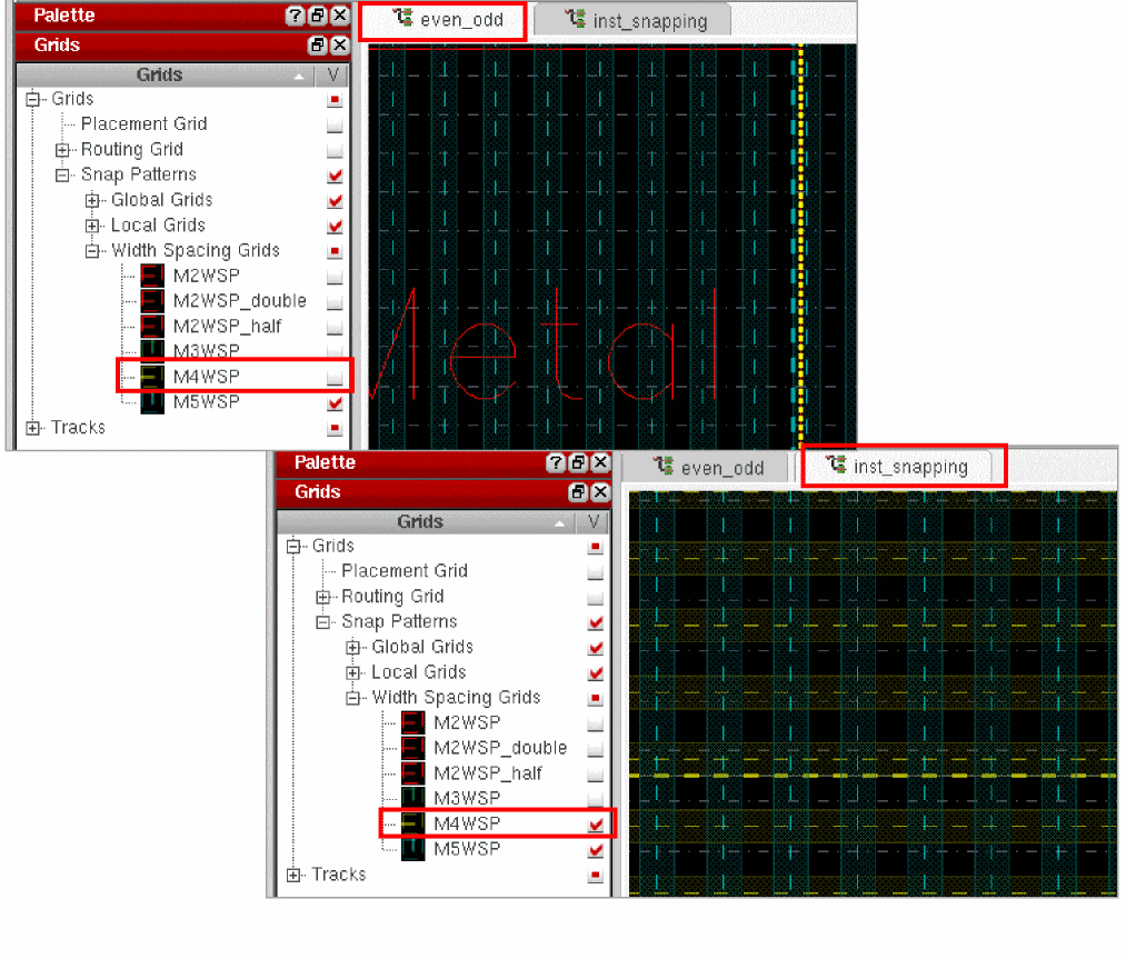 If you now turn off the visibility of WSP grid M4WSP in cellview even_odd, you will find that the visibility setting of WSP grid M4WSP in cellview inst_snapping remains unchanged.
