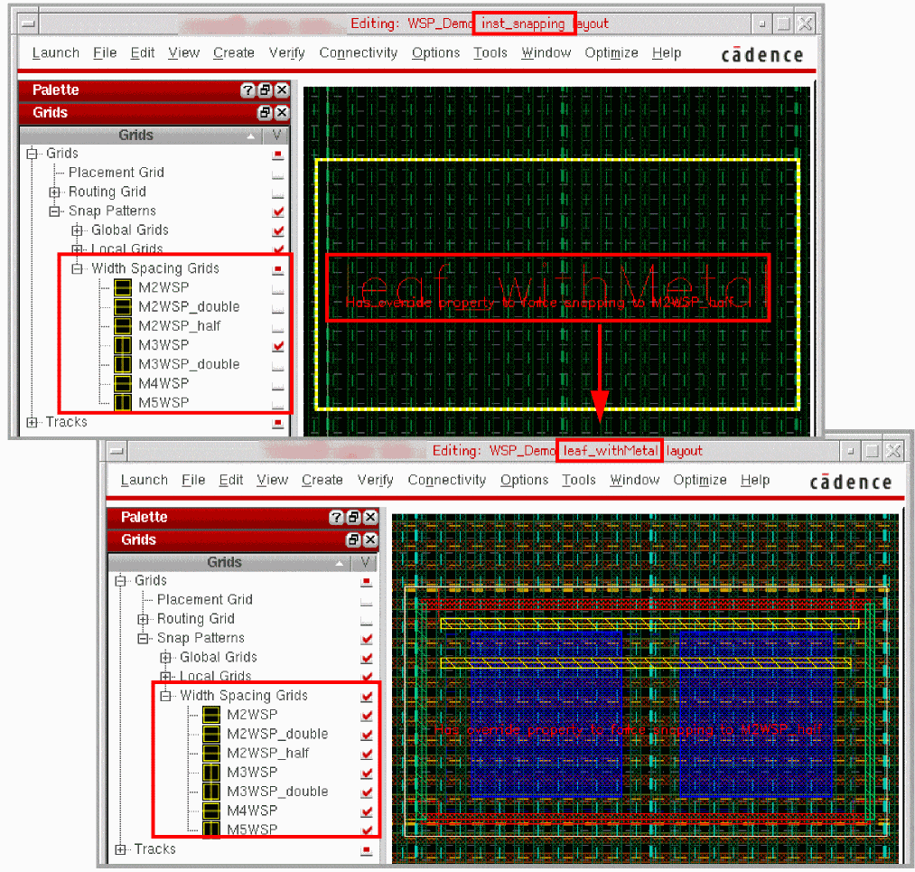 However, while editing a cellview, if you run the Edit In Place command or descend into a different cellview, the visibility settings of WSP grids are refreshed to reflect the settings for the cellview being edited, as shown in the example below.