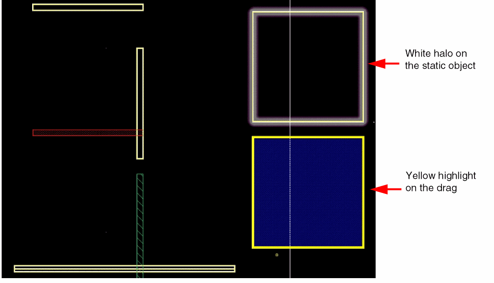 The object is snapped depending on its type: pin, region, or instance. The pointer is snapped to the snapping grid as you move the mouse. It gives a visual indication of how the objects will be placed after the editing command is complete.