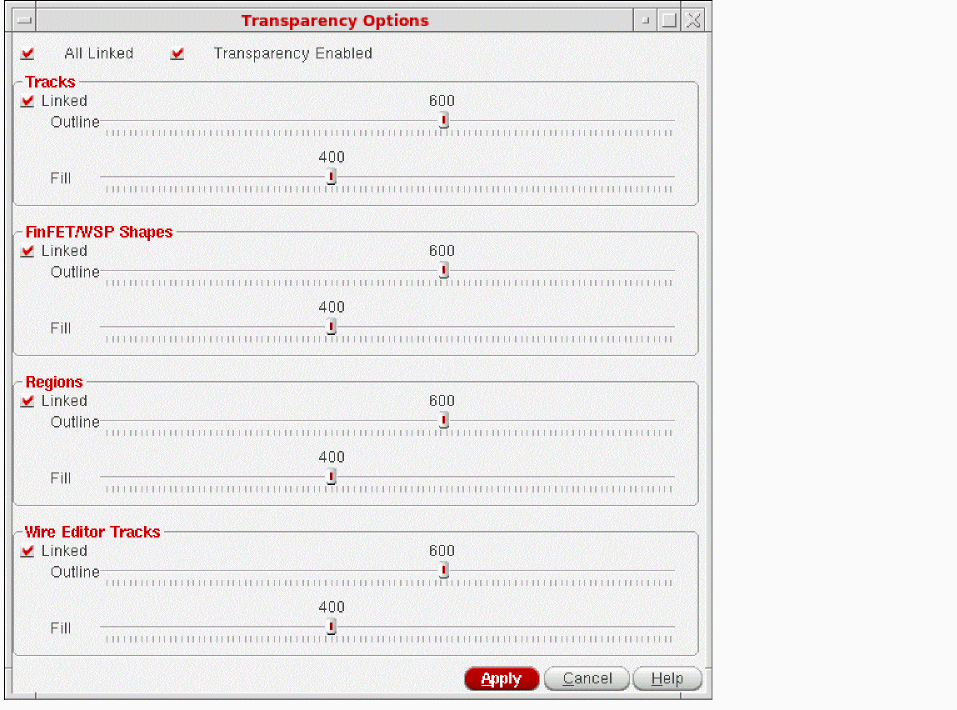 You can use the Linked check box to change the Outline and Fill values for Tracks, FinFET/WSP Shapes, Regions, or Wire Editor Tracks by tuning only one slider at a time. If you want to change the Outline and Fill values of Tracks, FinFET/WSP Shapes, Regions, and Wire Editor Tracks together by tuning only a single slider, select the All Linked check box.
