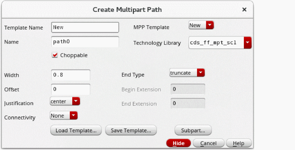 You can use a template to create a multipart path (MPP) or create a new MPP from scratch. The templates already defined in your technology library are listed in the MPP Template field of the Create Multipart Path form. You can also load MPP templates from ASCII files to add them to the templates listed in the MPP Template field and to the temporary technology file in the virtual memory.