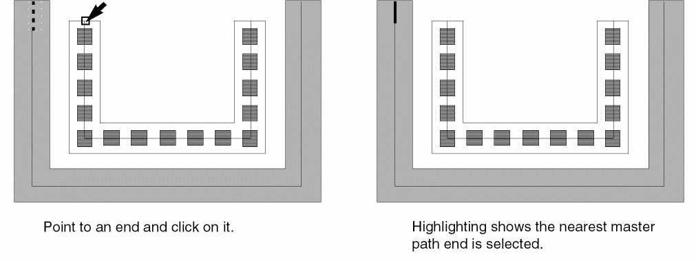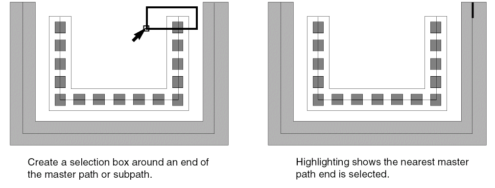 In partial selection mode, you can select an end of a master path in a multipart path. You cannot select the end of a subpart, except for chopped subpath ends. If you attempt to select the non-chopped end of a subpart, the nearest end of the master path is selected.