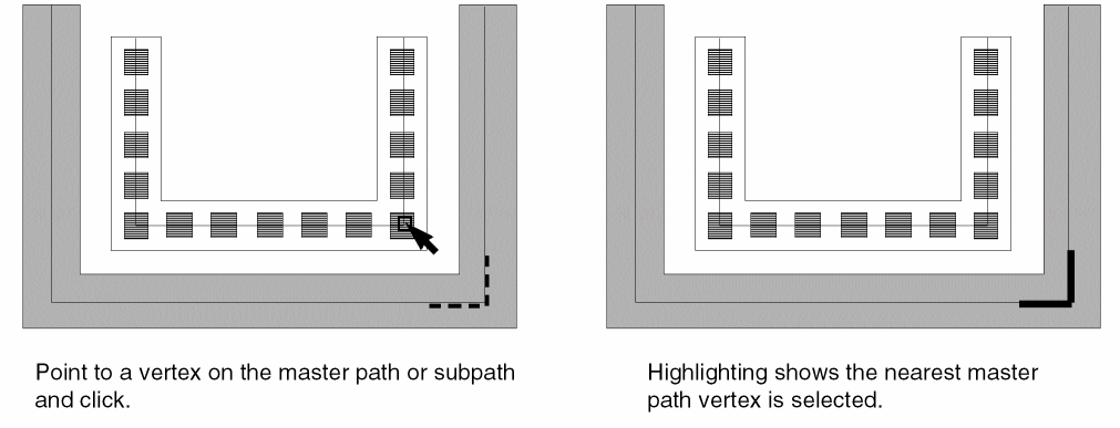 For multipart paths, a vertex is a point on the master path centerline where two segments join. You can select a vertex of the master path in a multipart path. To do so, you either select the master path vertex directly or select the nearest vertex of a subpath.