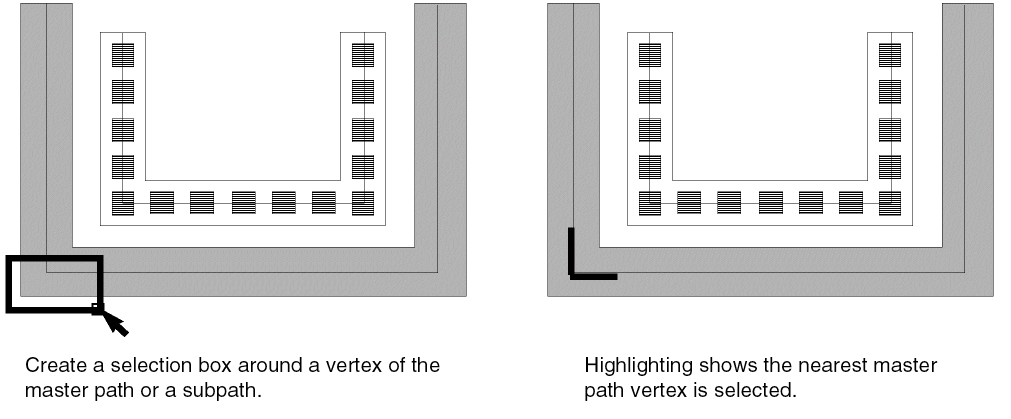 Create a selection box around a vertex on the centerline of a master path or subpath. If you click the corner of a subrectangle, the nearest master path vertex is selected.