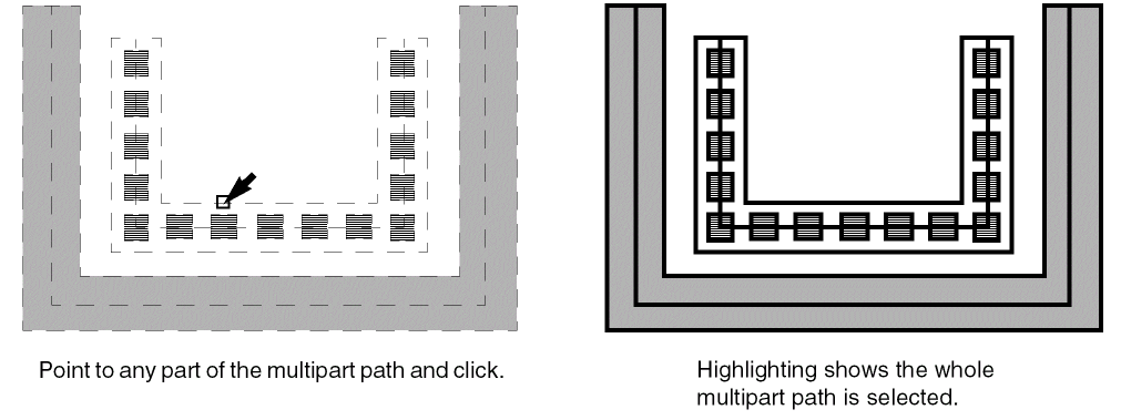 In full selection mode, selecting multipart paths is similar to selecting regular paths. When you select any part of a multipart path, the whole multipart path is selected. The master path is highlighted on the current selection layer, while subparts are highlighted on a different layer. This lets you see which part is the master path and which parts are subparts.